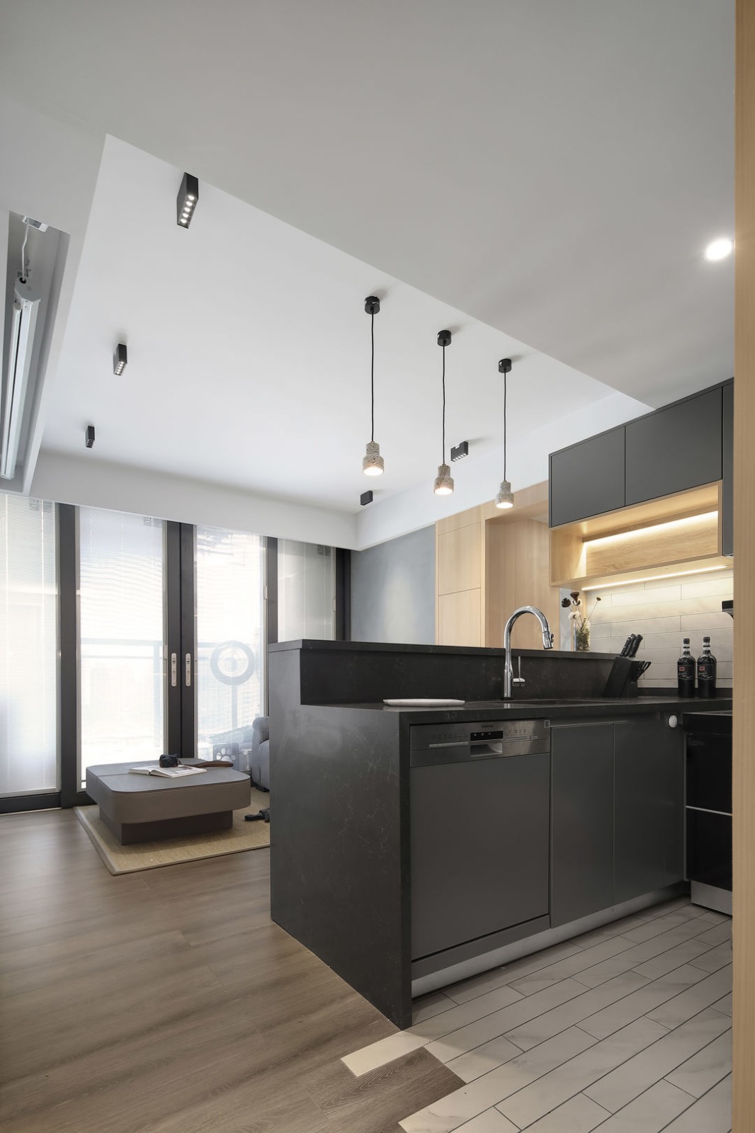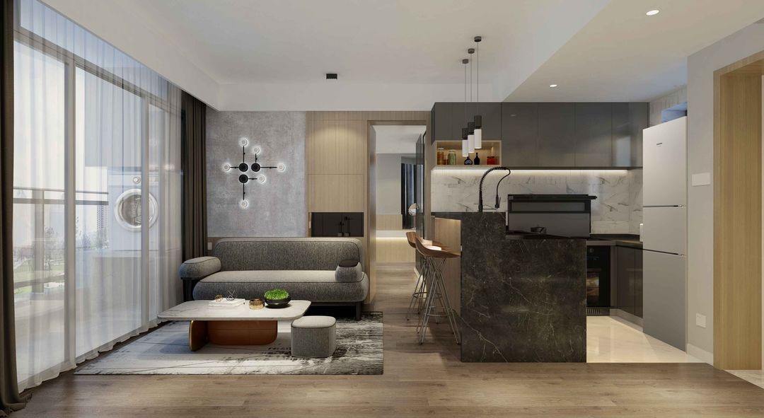 把廚房設計為開放式,吧臺和餐桌結合(很少做飯,平時都是點外賣)。