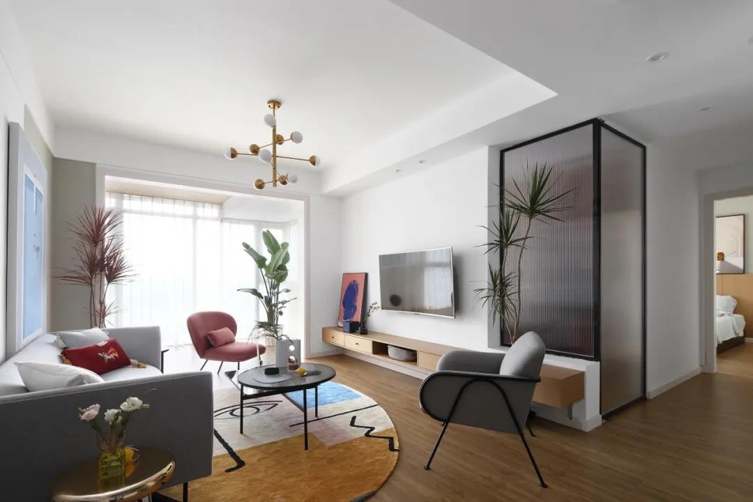 電視墻以懸空的木質電視柜+壁掛電視機,電視墻右邊加入長虹玻璃的室內隔斷,讓空間的光線得以共享,同時也增加了空間的設計感。