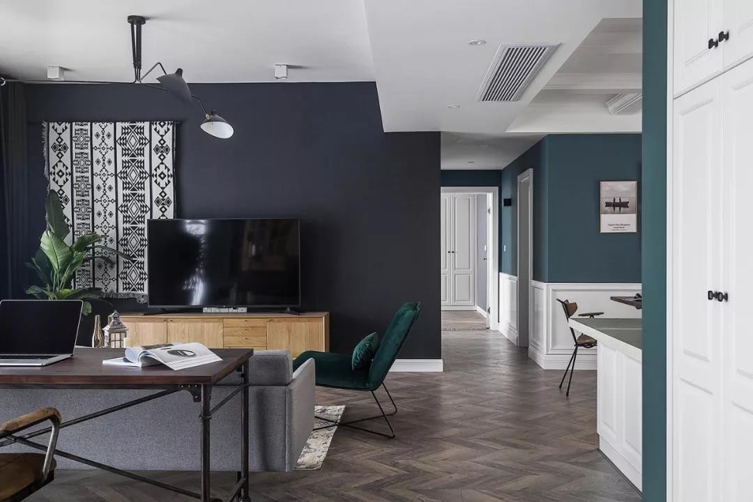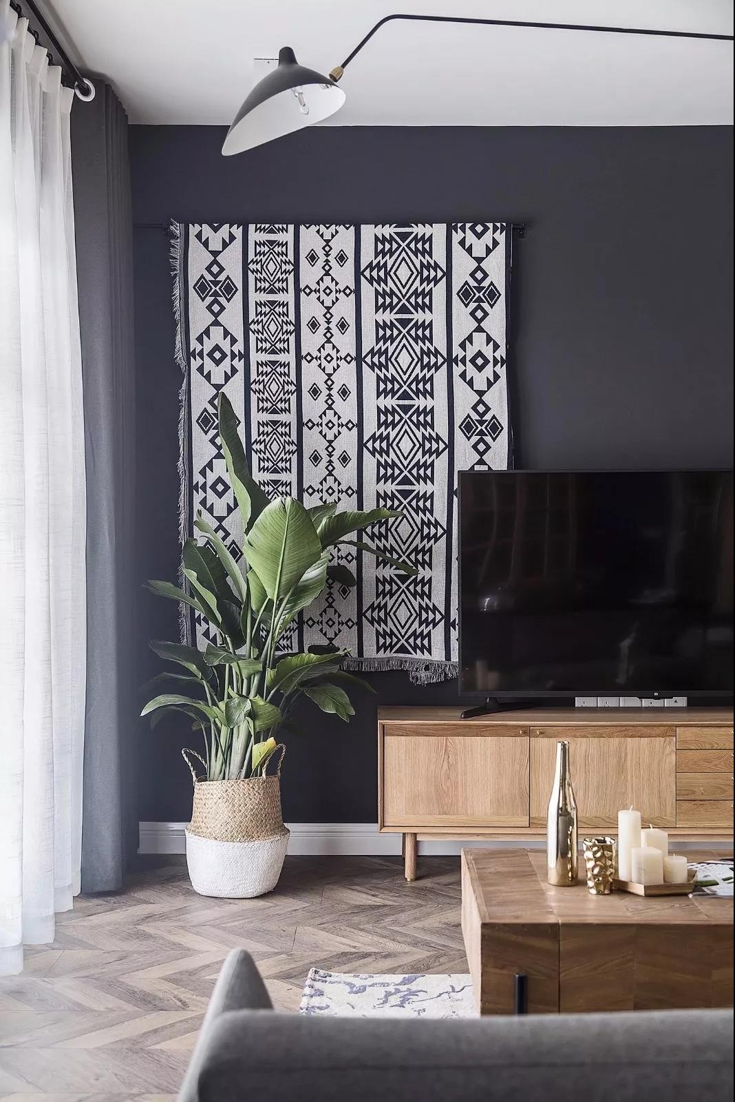 電視墻的設(shè)計也很有特色,在偏左的地方掛上一塊黑白相隔的毯子,在深灰色的電視墻上做了一個視覺沖擊的一個設(shè)計,讓電視墻看起來不單調(diào),有個性。