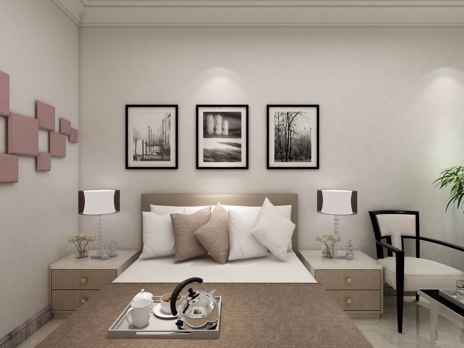 主臥,延續(xù)白+木基調(diào),用吊燈,窗簾,地毯為空間添彩,打造出清新自然的舒適環(huán)境。