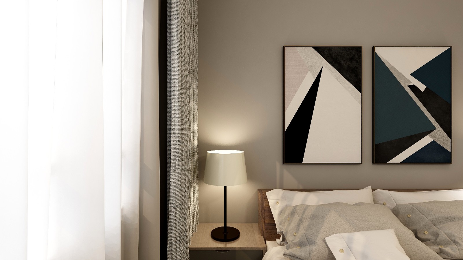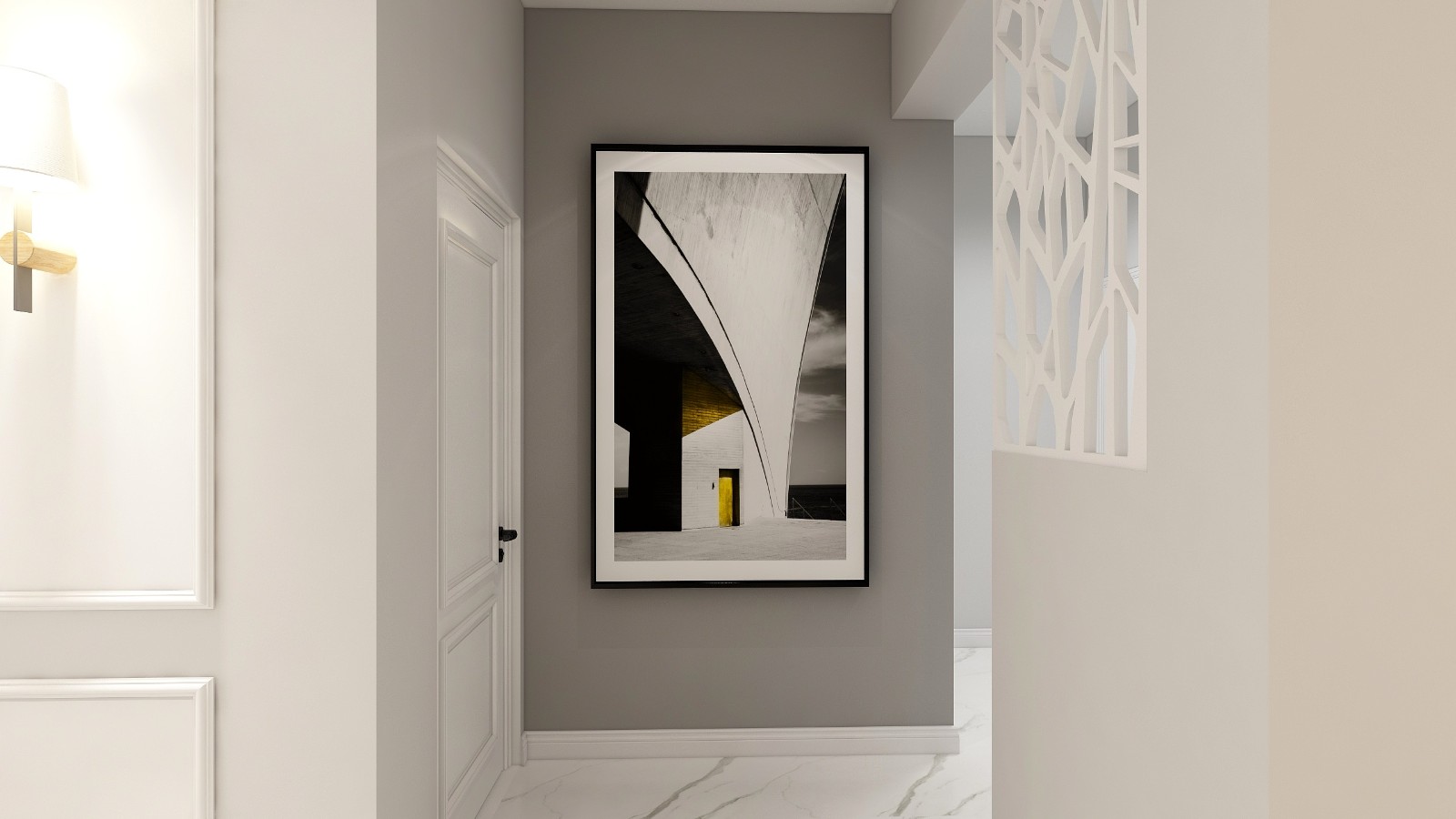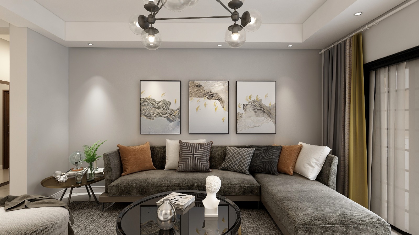 淺灰色的背景墻面漆,時(shí)尚動(dòng)感的簡約風(fēng)掛畫,十分具有現(xiàn)代風(fēng)。一絲工業(yè)元素的棕灰色沙發(fā)搭配黑色的茶幾,深灰色加入一抹亮色黃,使空間的流行元素渲染出來。